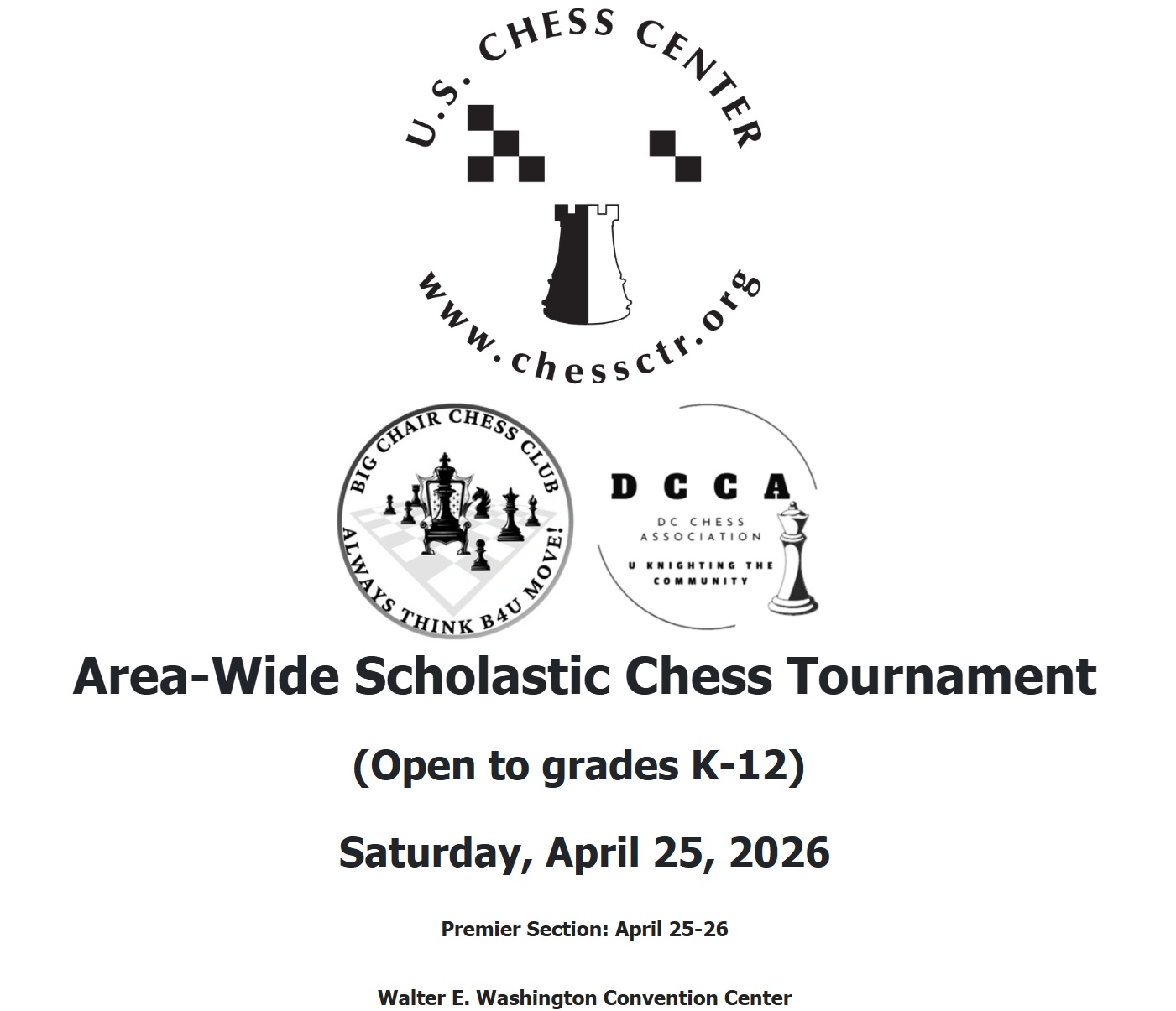 We measure our students’ success in a variety of ways. The number of friends they make at competitions is our favorite way. Competing in formal competitions is the best way for kids to get better at chess. Towards that end, the Center is sponsoring a large, inexpensive event April 25 at the Walter E. Washington Convention Center in Washington, DC. Students from kindergarten through 12th grade may register at this page.